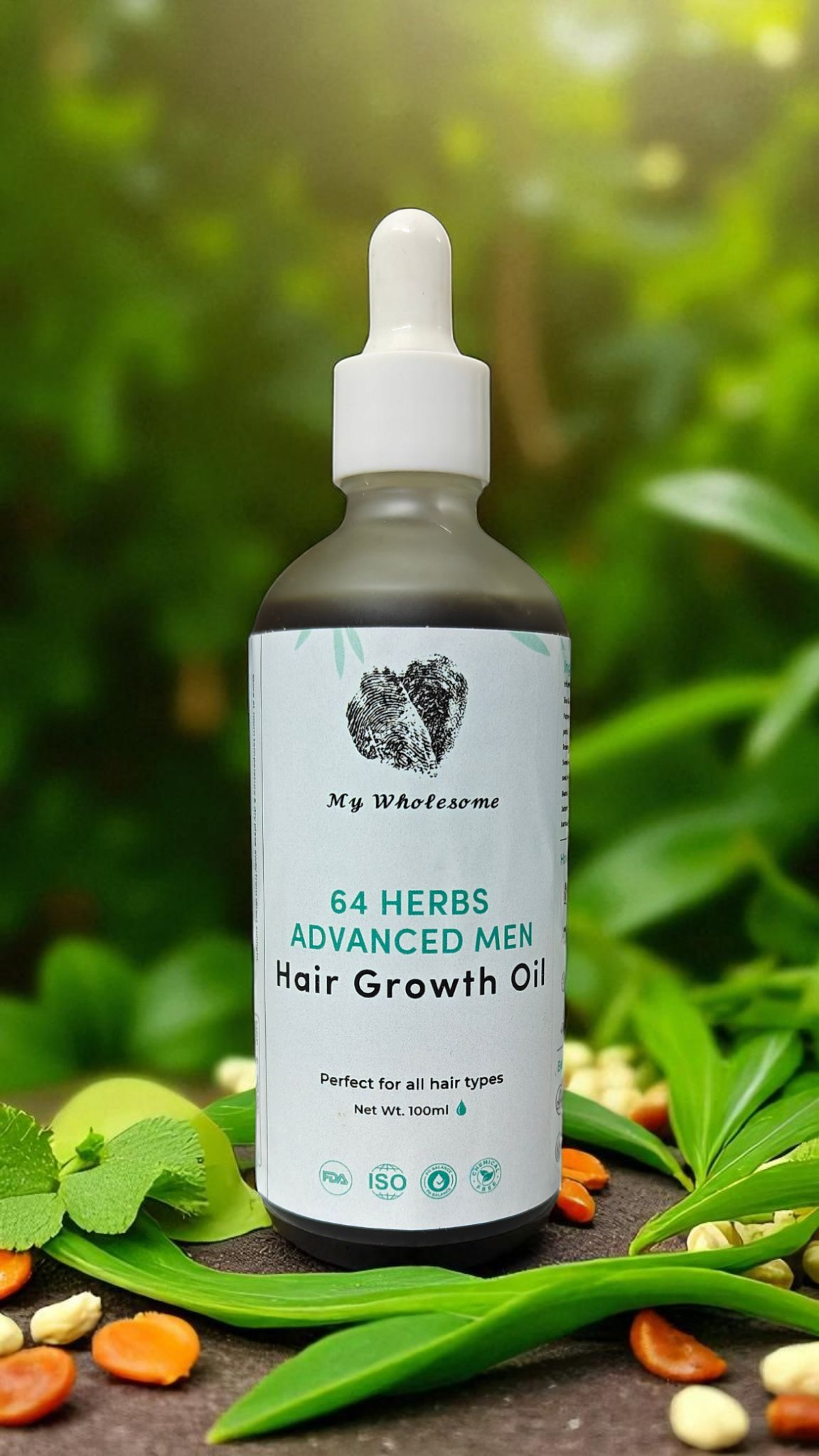 64 Herbs Advanced Men Hair Growth Oil is a potent Ayurvedic blend of 64 herbs and essential oils formulated to combat male hair thinning, bald spots, and scalp weakness. It deeply nourishes the roots, strengthens the follicles, and promotes visible regrowth with regular use.