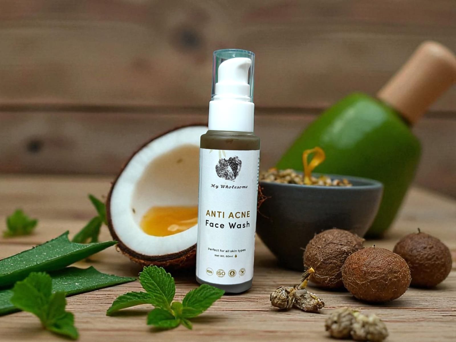 Neem Extract – Fights acne-causing bacteria; Tea Tree Oil – Reduces redness and inflammation; Tulsi – Detoxifies and purifies skin; Aloe Vera – Soothes and hydrates; Salicylic Acid (optional) – Unclogs pores and prevents breakouts.