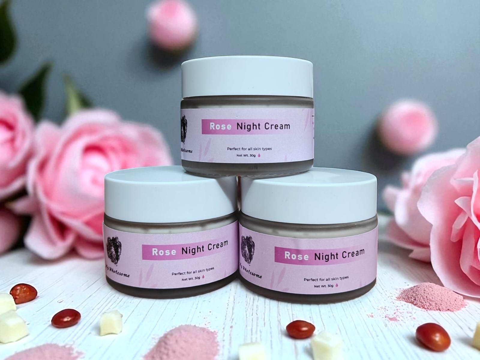 Rose Night Cream is a gentle, deeply nourishing overnight formula enriched with pure rose extracts and moisturizing botanicals. It works while you sleep to hydrate, soothe, and restore the skin, helping you wake up with soft, refreshed, and naturally glowing skin.
